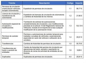 Tabla de precios de tasas de Tráfico de la DGT